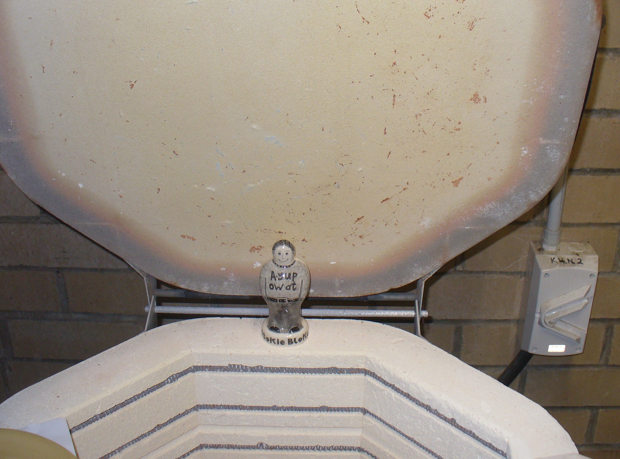My very own Stokie Bloke http://www.moorlandpottery.co.uk/stokie-bloke-figure-p-287.html guards over my kiln in Mullumbimby.