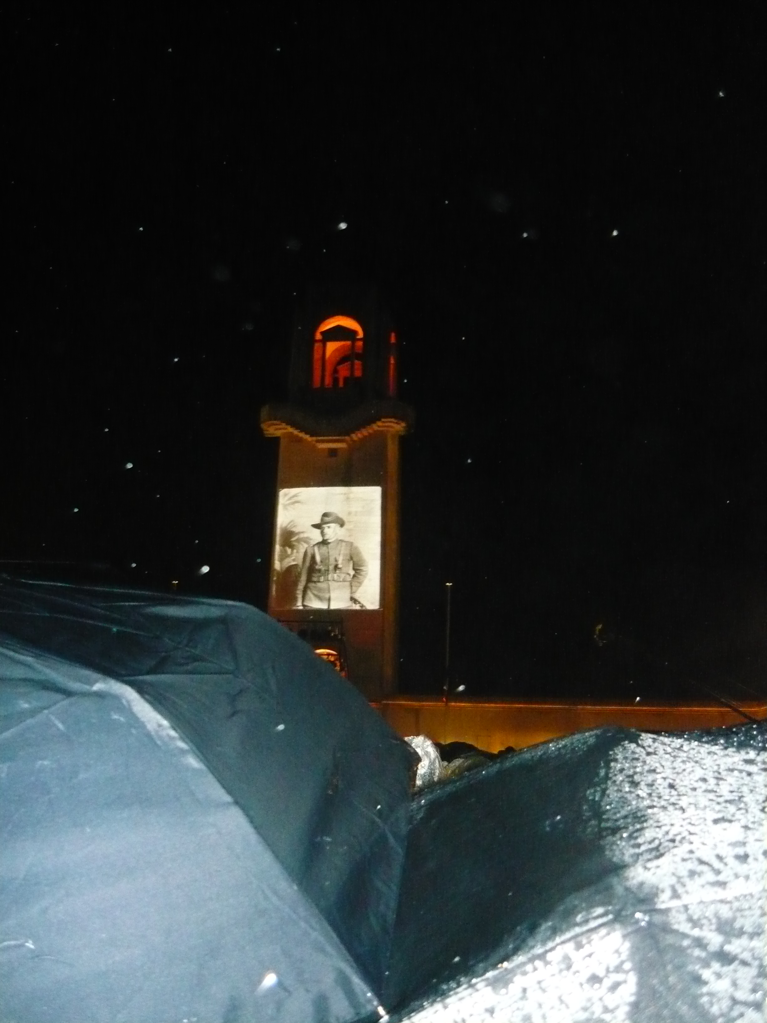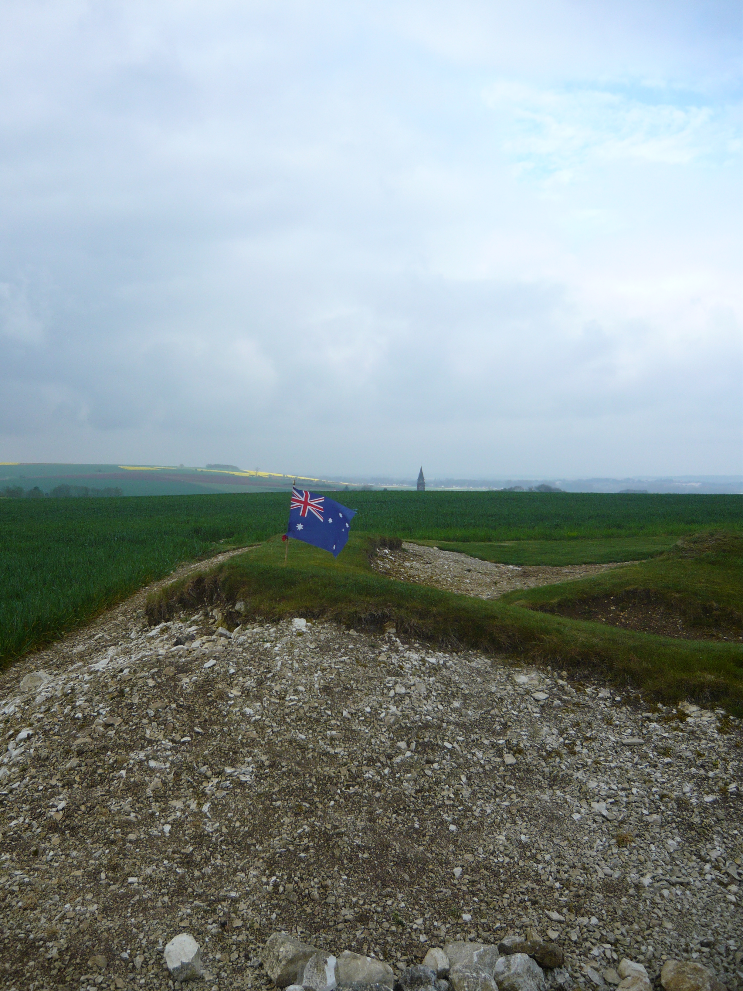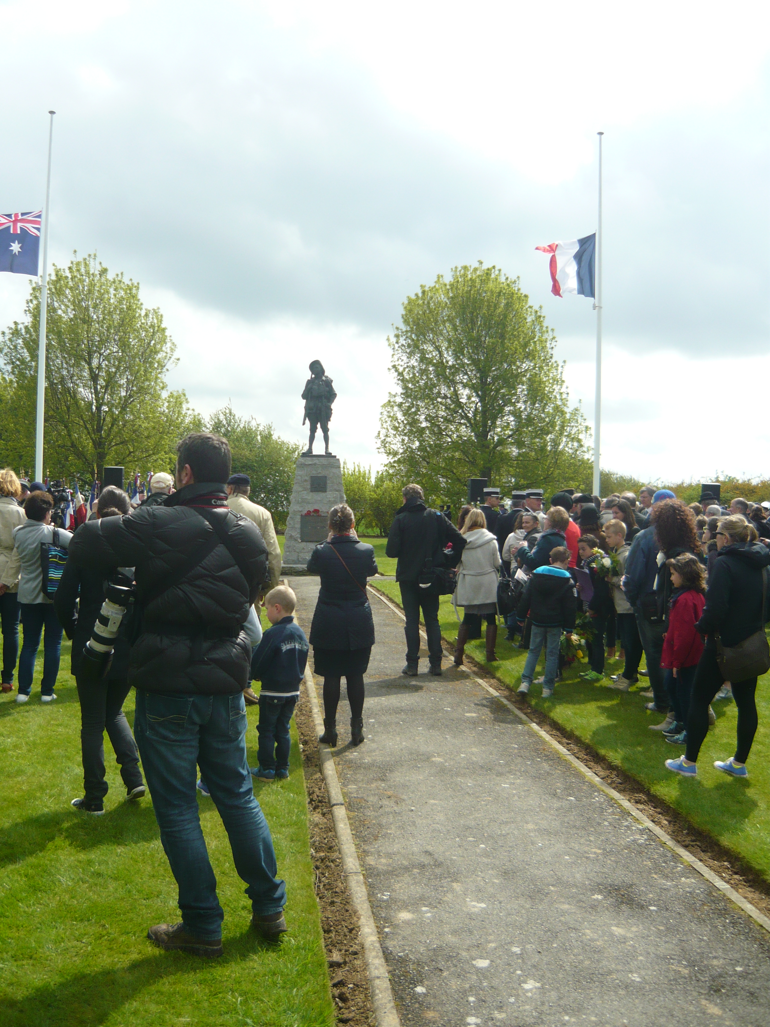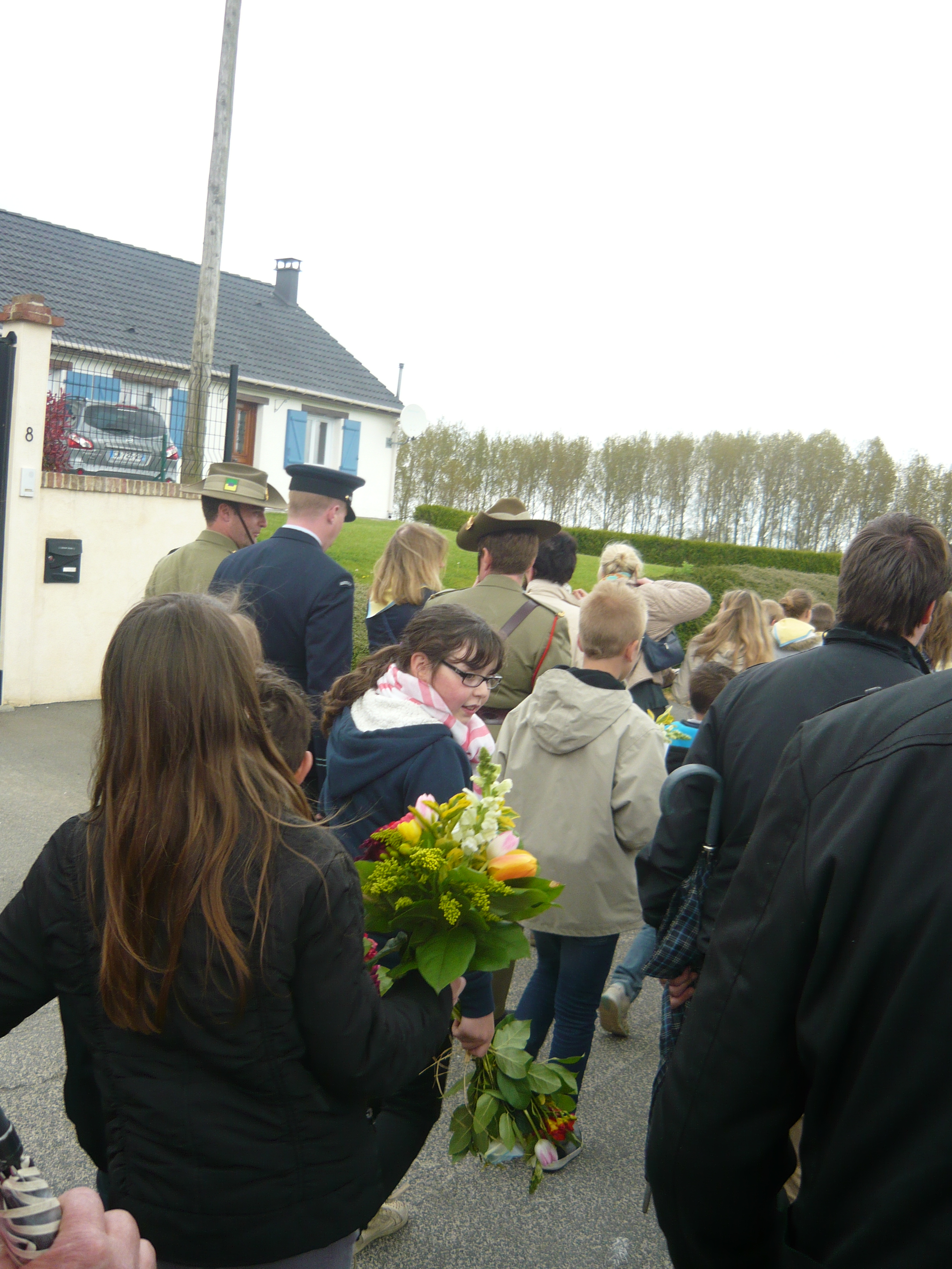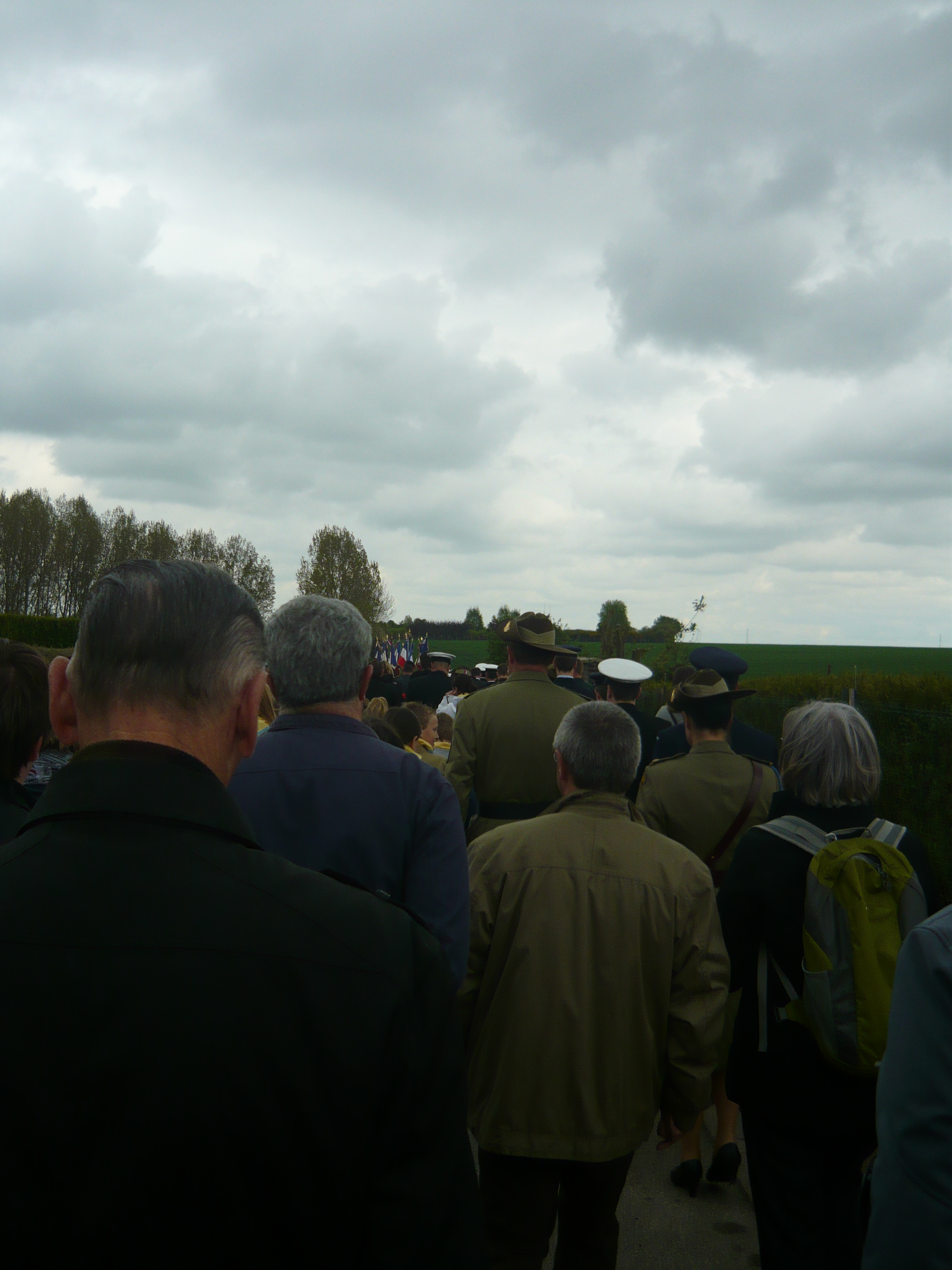 and then to Bullecourt. AT Bullecourt there was one ceremony at the memorial statues in the town. After that we walked behind the band and the main party, moving to the sound of Waltzing Matilda and Click Go the Shears and some stirring French tunes. We walked up to the battlefields and the Digger Memorial Statue. I liked this last ceremony very much – the school children read poems and participated in the ceremony and there was a wonderful community spirit.