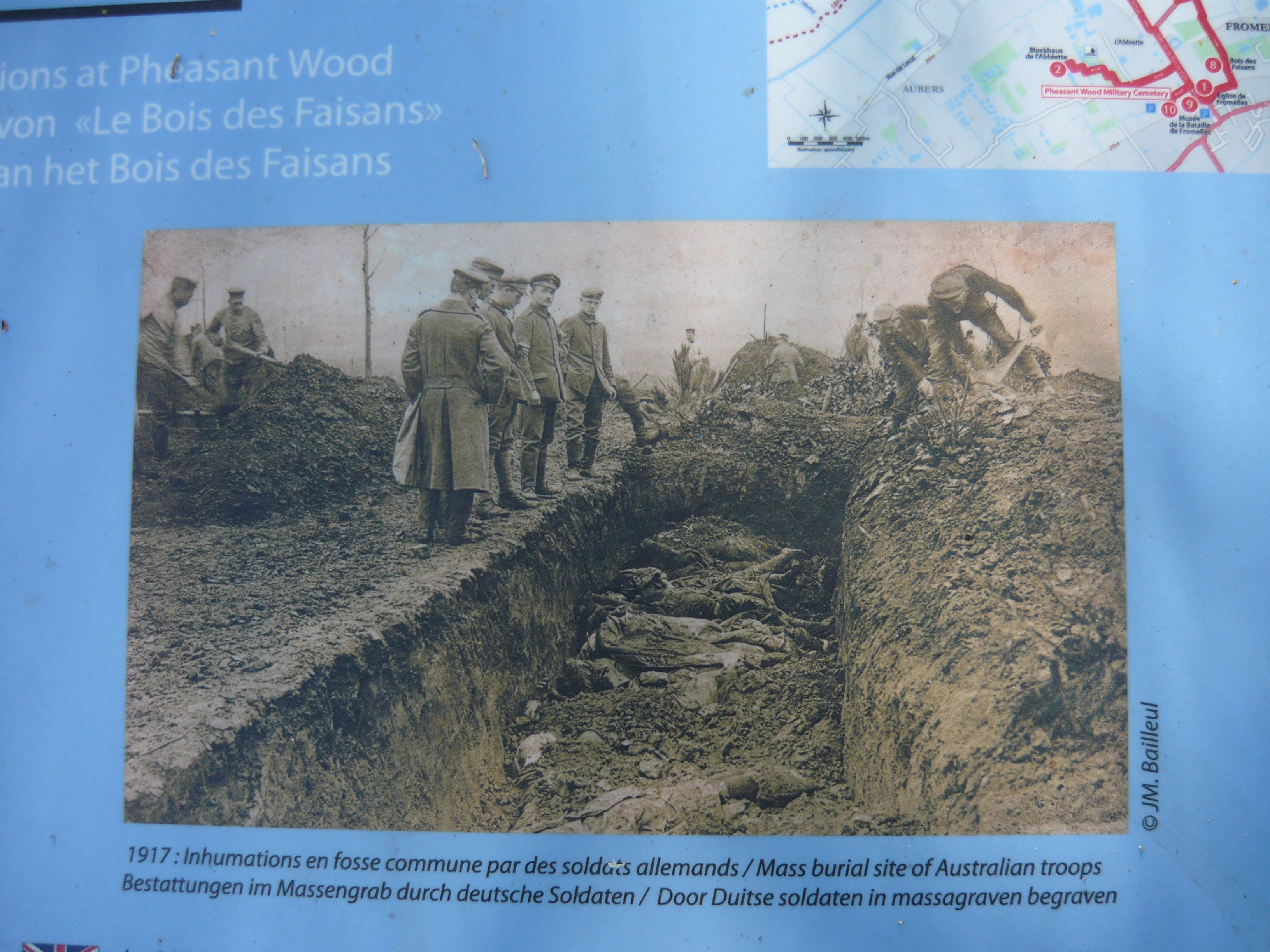 This afternoon I ventured into Pheasant Wood. It is in this place that 250 Australian Soldiers were buried and lay unidentified until 2009. Then an Aussie school teacher decided to do some research and found the grave site. After much paperwork I imagine, excavation proceeded and then DNA identification has taken place. One of ladies at Mullumbimby is presently being DNA tested to identified one of the soldiers Albert Paton. Pheasant Wood is such a peaceful spot. And indeed on my first day here I saw a pheasant flying into the woods as if to say hello. In the wood all you can hear are the birds. All you can see are trees and woodland. It is hard to imagine the bombing and the mud and the horrors of 100 years ago.