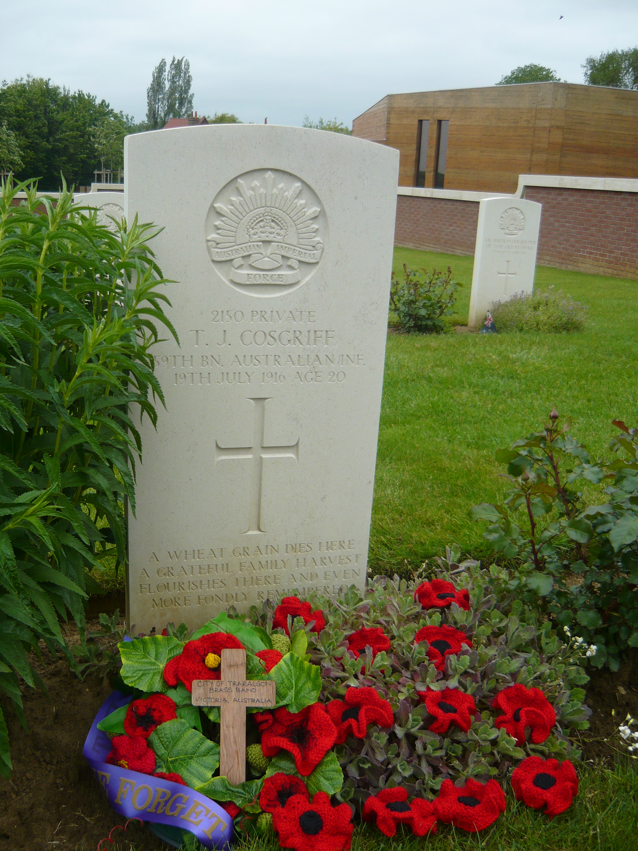 And I had one cross left – which I had brought with me from Australia. In a very touching moment 2 of the young members of the group wrote a message and placed the cross at the Memorial – and as promised I have taken the cross and placed it on the grave of T J Cosgriff – a relative of one of the band members.