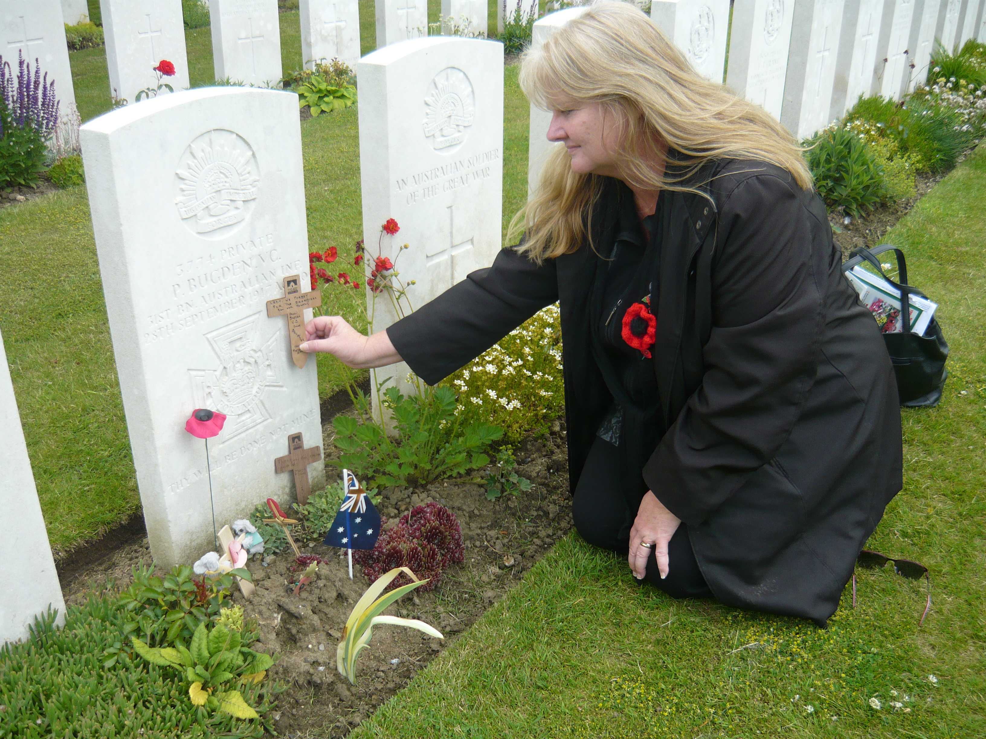 Wednesday was a fabulous day – a huge thank you and a hundred Merci’s to Brigitte and Liz Millward for a fabulous day out in Belgium. By pure chance I came across the grave of Paddy Bugden – Thérèse Ingelaere Bless her – gave me a book on ANZACs there was Paddy and the details of where he was buried. A quick request to Liz and as the grave was near where we were going to Iper that very morning and we found it. I was able to place Anne’s cross on Paddy’s grave. Hooge Crater, Polygon Wood, Tyne Cot and the Last Post at the Menin Gate.