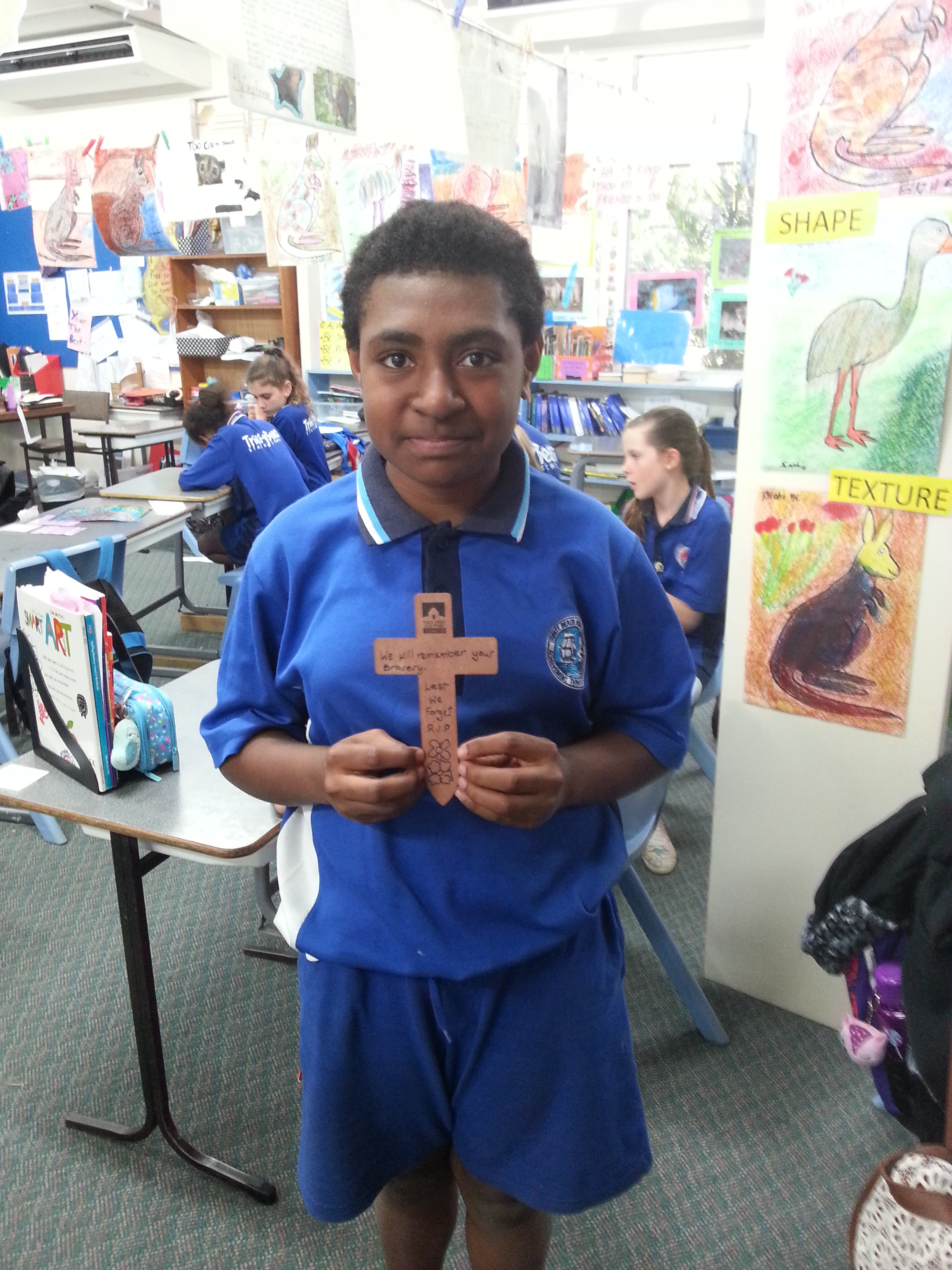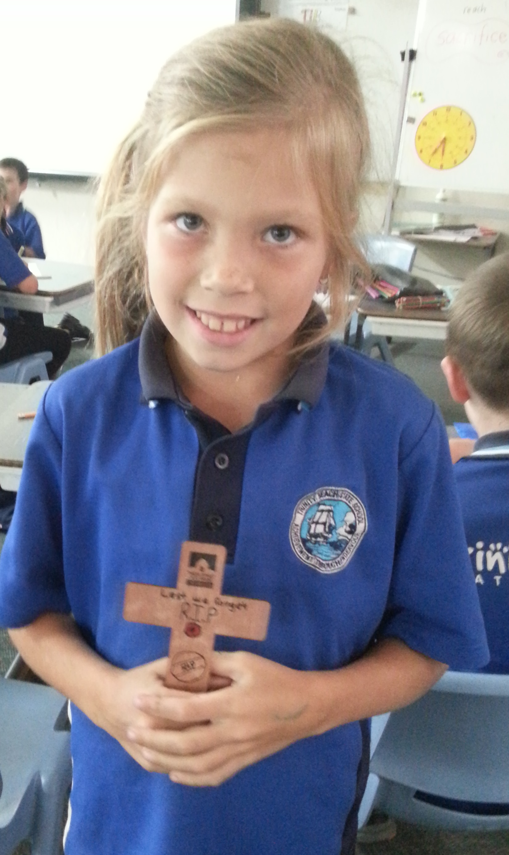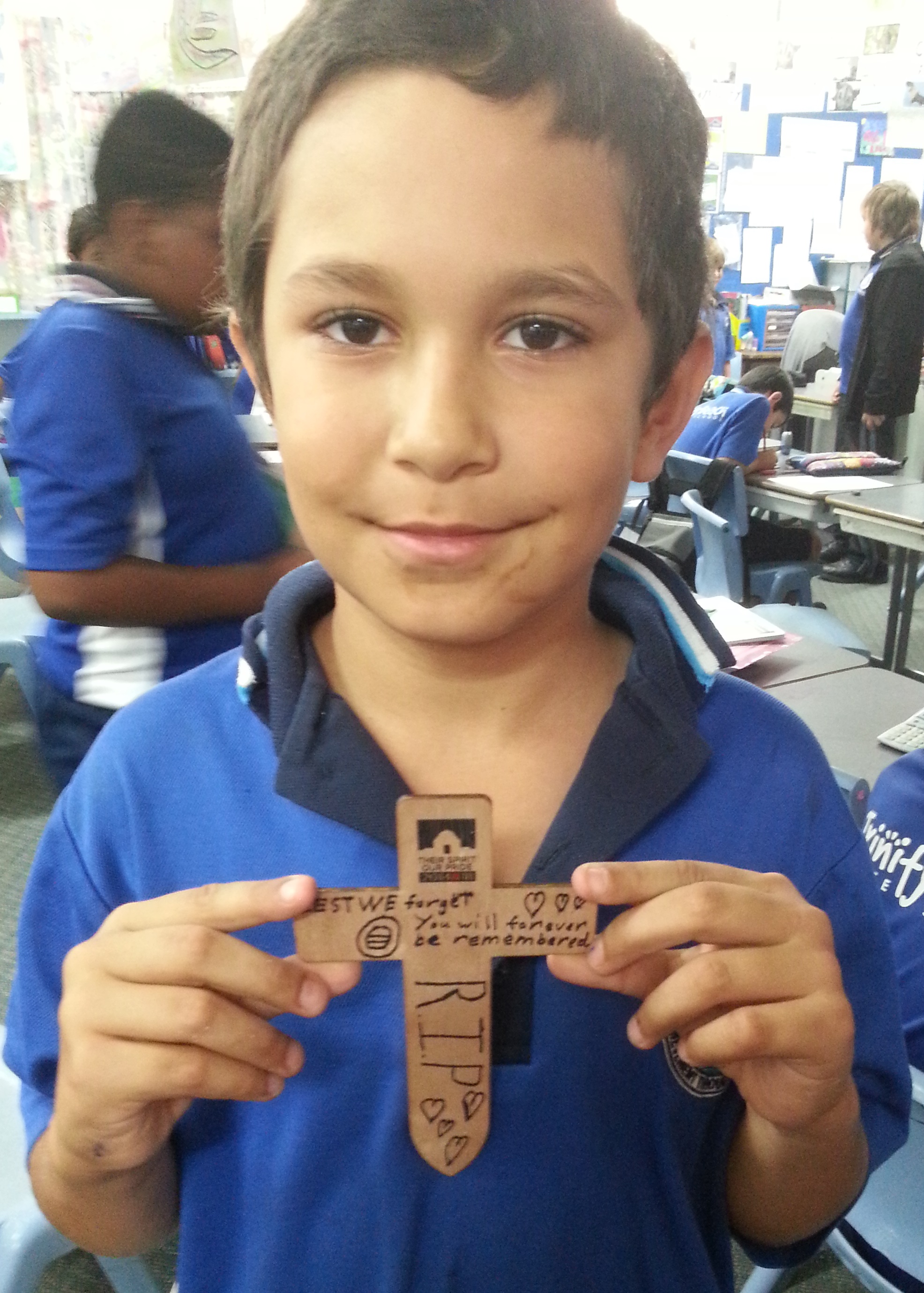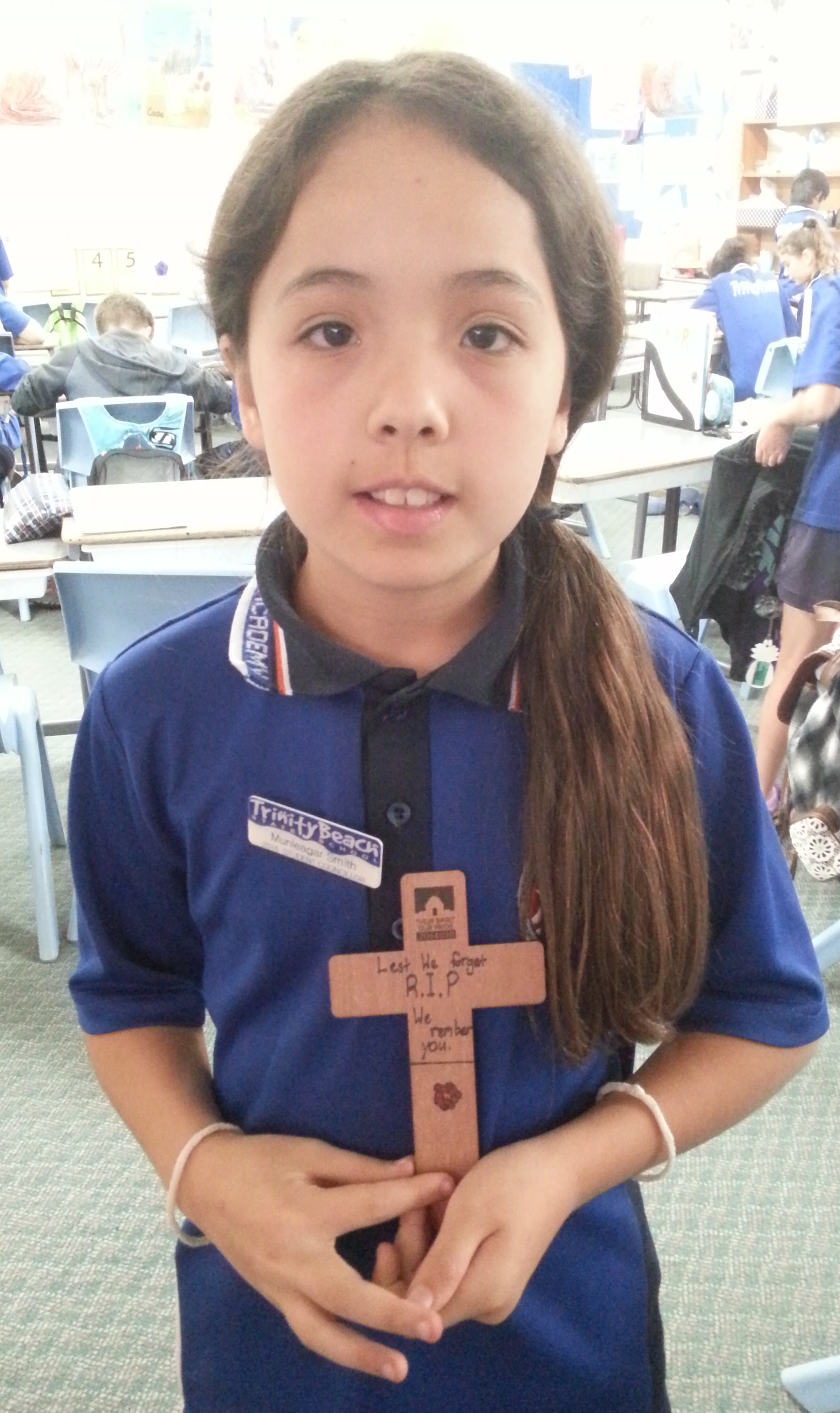 When I was in Cairns I had the pleasure to visit Trinity Beach State School where some fabulous students wrote messages of Commemoration to our fallen soldiers. The crosses were supplied by the Australian War Memorial