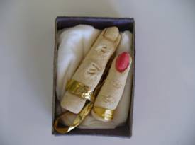 White Raku clay, fired to bisque with underglaze. Third Fingers Left Hands represents the rough preparation couples have before getting married. The roughness of nails and fingers shows how the coming years will chip away from bodies not properly prepared for weathering conditions.  Lying on a bed of tissues ready to absorb wedded tears, the fingers are tied together with bands of gold. Cheap curling ribbon symbolising the future couples face in an economic and environmentally challenged world.  With experience that could fit inside a matchbox, their wedded dreams could go Up In Smoke at any time.